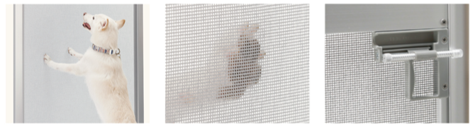 爪でひっかいても破れない、丈夫な樹脂コーティングネットを採用したペットの爪によるひっかきにも強い専用網戸。ペットによる誤った網戸の開閉を防ぐ安心ロック付き。ペットだけでなく、小さなお子さまのいるご家庭にも安心の機能です。