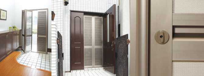 リリーブは、風通しのよさはもちろん、セキュリティー面にもこだわった、玄関ドア用の折戸式網戸です。通風部分には、金属製パネルを採用。網戸としての機能を保ちながら、強風によるネットのたわみやペットによる損傷などもガードします。スマートで高級感あふれるデザインが、玄関に安心と快適をプラスします。