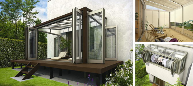 テラスやバルコニーを活用した囲い空間は、住まいの内と外をつなぎ、暮らしに彩りを添えてくれるもう一つの快晴空間。暮らしや設置場所に合せてサイズや窓の組み合せをお選びください。