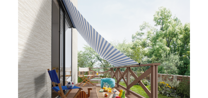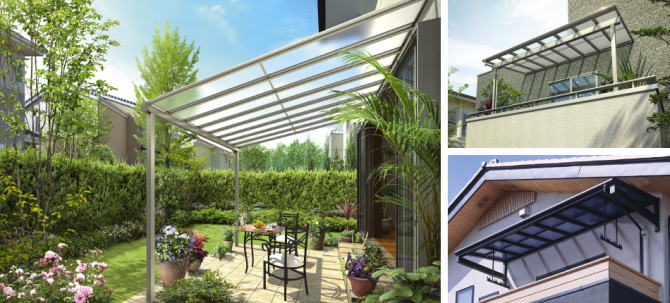 庭先やバルコニー空間の日差しをやわらげ、雨の吹き込みを防ぎます。光と風が心地よい、さわやか空間を演出します。1階のテラスや勝手口、2階のバルコニー、風の強い3階まで。設置場所や敷地条件、使い勝手に合せて適切なアイテムが選べます。